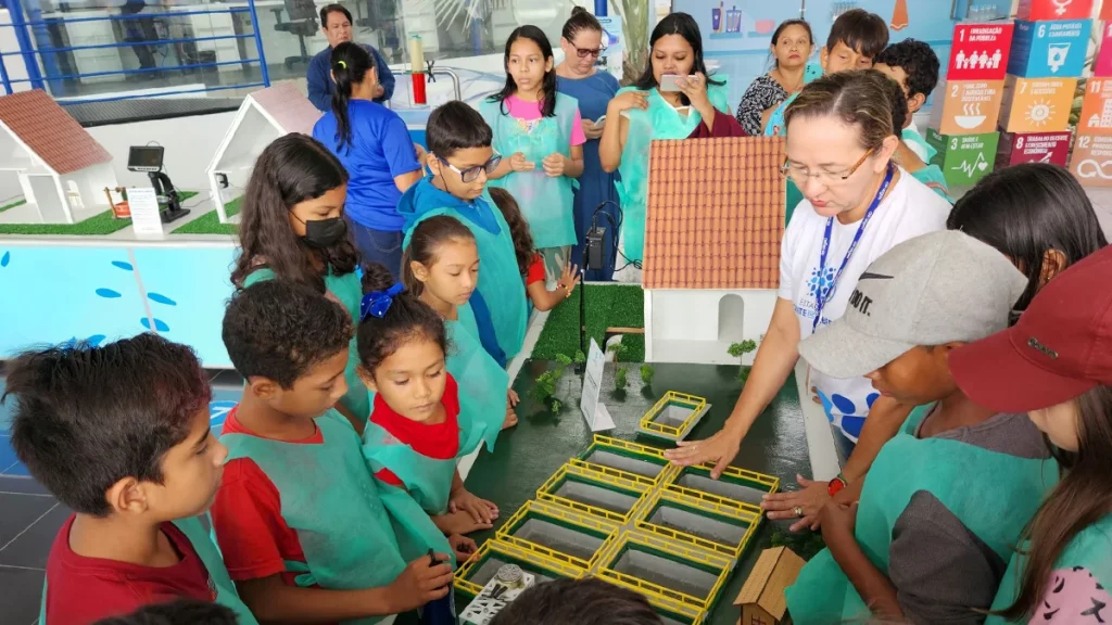 Um dos destaques do museu é o diorama com arte RGB, que mostra a cidade de Manaus com e sem saneamento, evidenciando o impacto direto da infraestrutura urbana na saúde das pessoas e na preservação ambiental. Ao final da visita, as crianças são convidadas a desenhar o que aprenderam, reforçando os conceitos de forma criativa e afetiva.